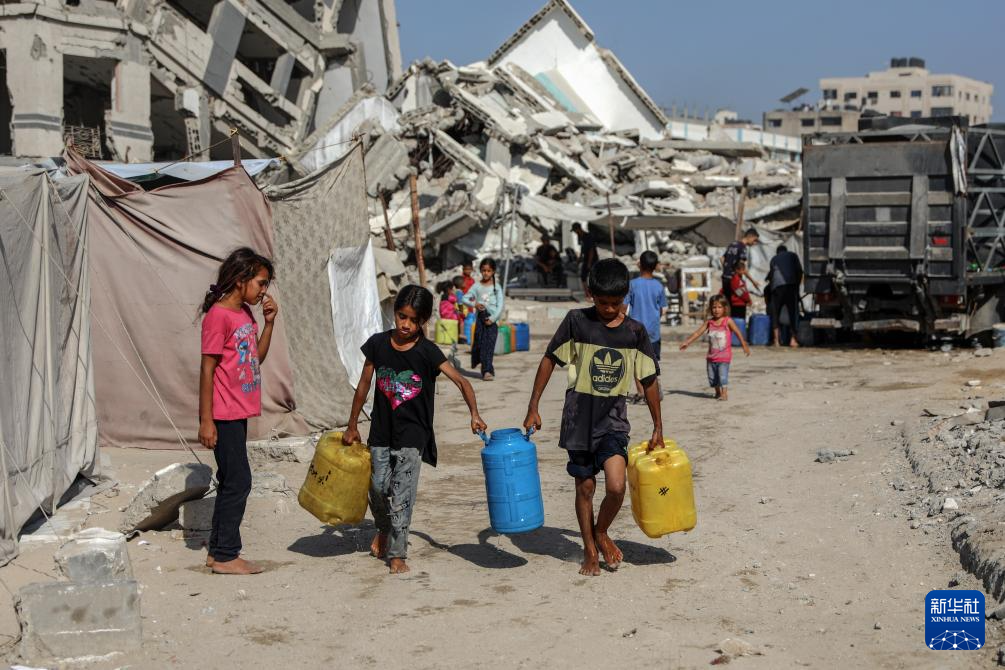 2025年7月17日,巴勒斯坦儿童在加沙城北部地区取水。
