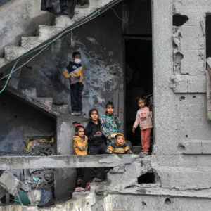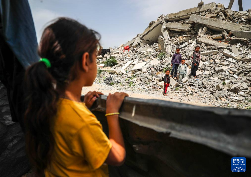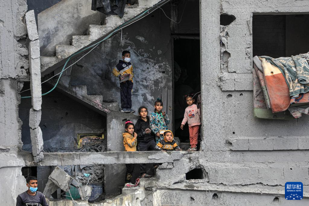 2024年2月22日,在加沙地带南部城市拉法,巴勒斯坦儿童站在以军空袭后的废墟中。