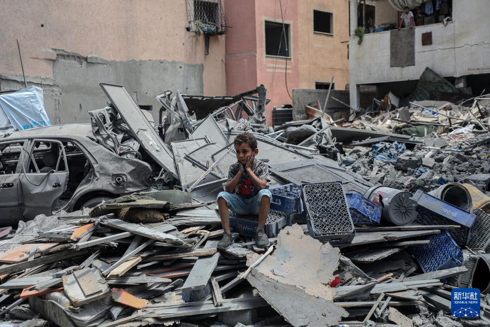 2025年8月8日,一名男孩坐在加沙城以军袭击后的废墟上。