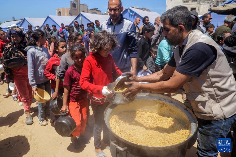 2025年4月19日,儿童在加沙城排队领取救助食物。