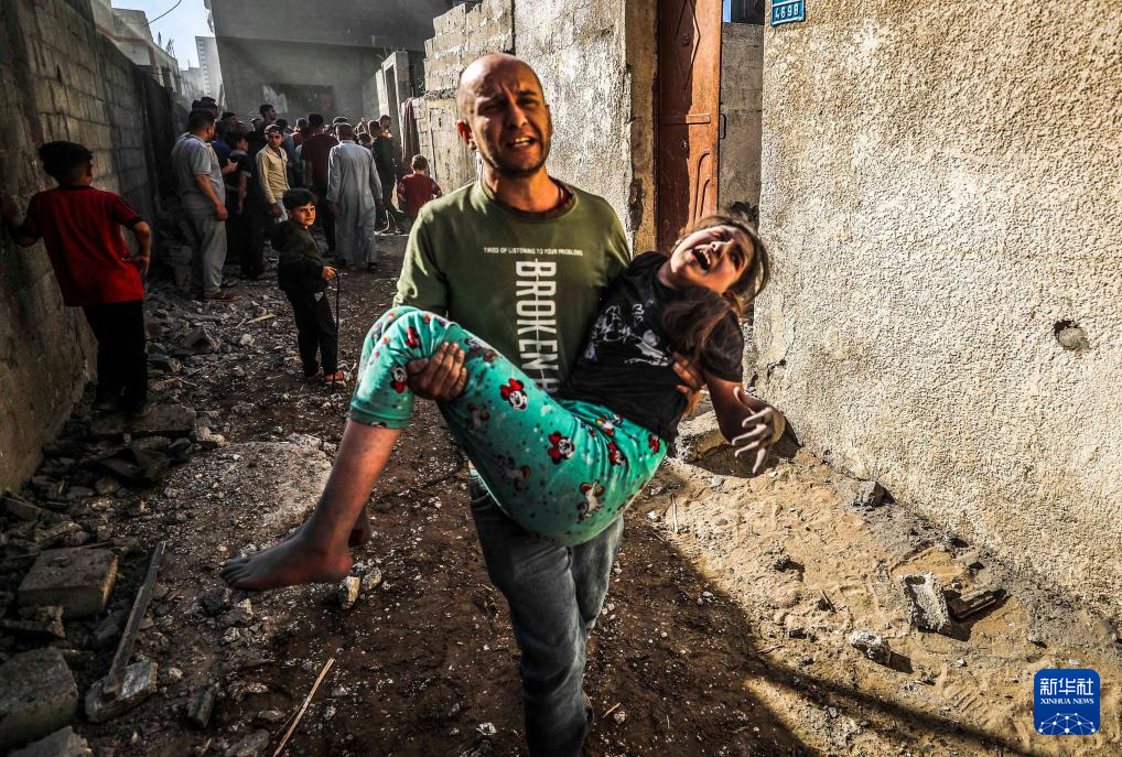 2025年5月21日,在以军空袭加沙地带北部杰巴利耶难民营所在区域后,一名男子抱着受伤的女孩寻求救援。