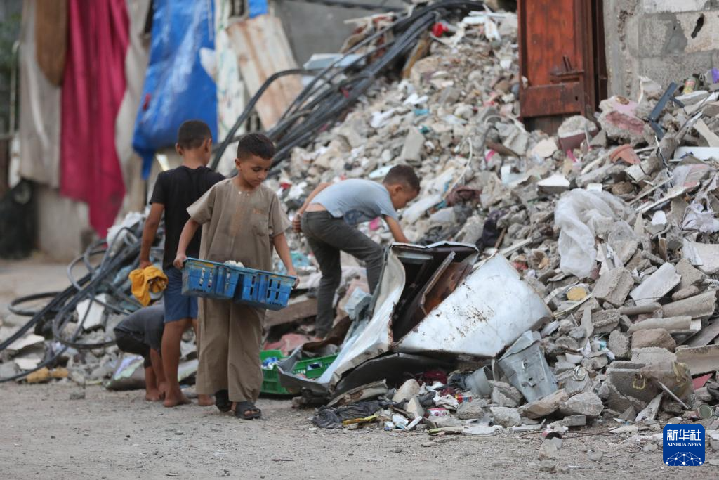 2024年9月3日,孩子们在加沙地带中部努赛赖特难民营的一处建筑废墟中搜寻物品。