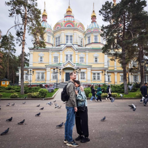9月30日,一对情侣在哈萨克斯坦阿拉木图的28勇士公园相拥(手机照片)。