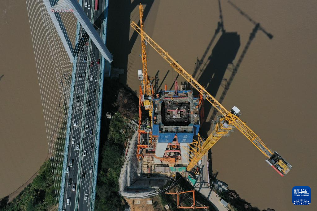 10月6日拍摄的在建的甬舟铁路桃夭门公铁两用大桥6号主塔(无人机照片)。