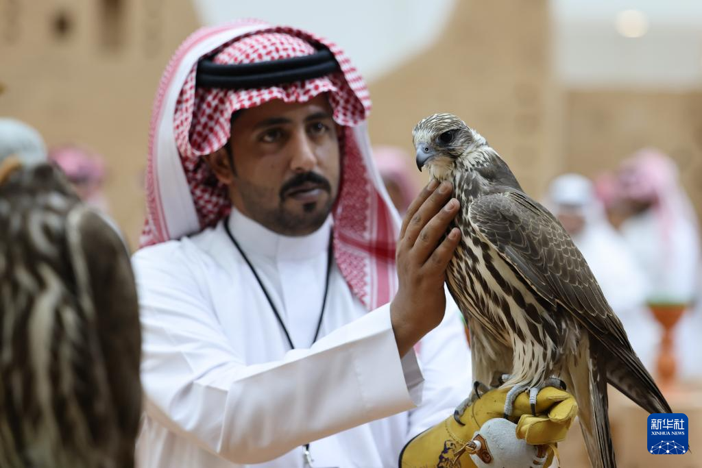 10月6日,在沙特阿拉伯首都利雅得,沙特展商向观展游客展示出售的鹰隼。