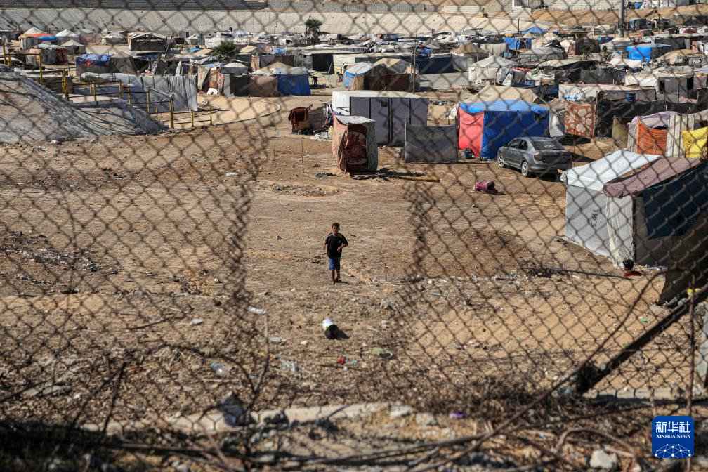 2024年9月4日,在加沙地带南部城市汗尤尼斯,一名巴勒斯坦儿童走在临时住所附近。