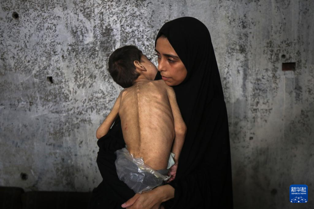 2025年7月25日,在加沙城一处避难所,一名女子怀抱营养不良并患病的儿童。