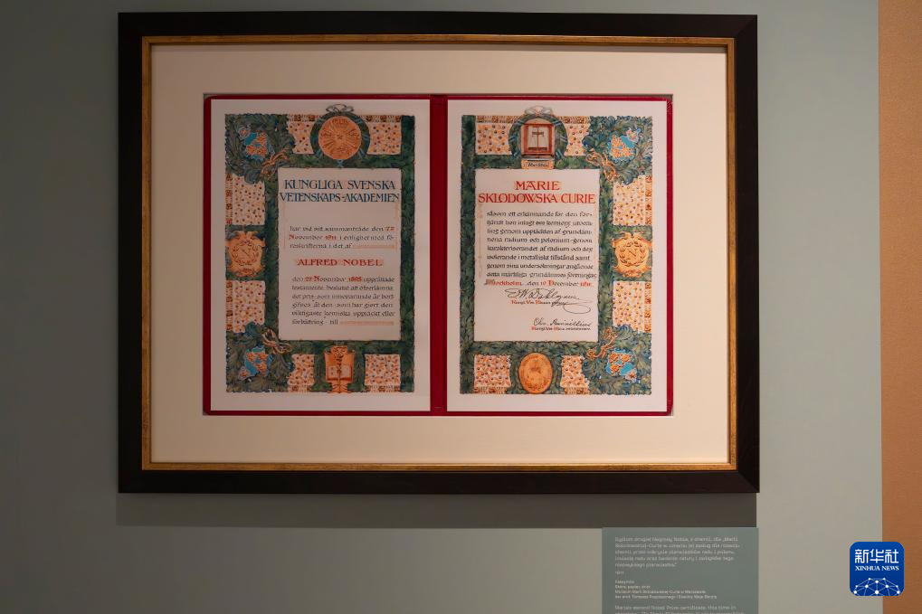 这是10月7日在波兰华沙的玛丽·斯克洛多夫斯卡-居里博物馆拍摄的居里夫人1911年获得诺贝尔化学奖的证书复制品。