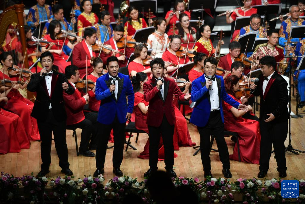 10月7日,演员在音乐会现场表演男声重唱《边疆处处赛江南》。
