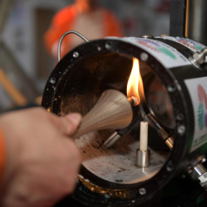 在科考船甲板面,“源火”采集组副组长,广州海洋地质调查局副总工程师沙志彬(左)用引火棒将“源火”转移至“源火”盒(9月18日摄)。