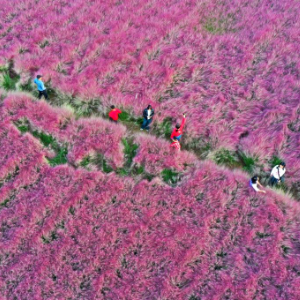 10月8日,游客在河南省许昌市清潩河畔粉黛乱子草园游玩拍照。