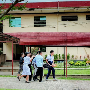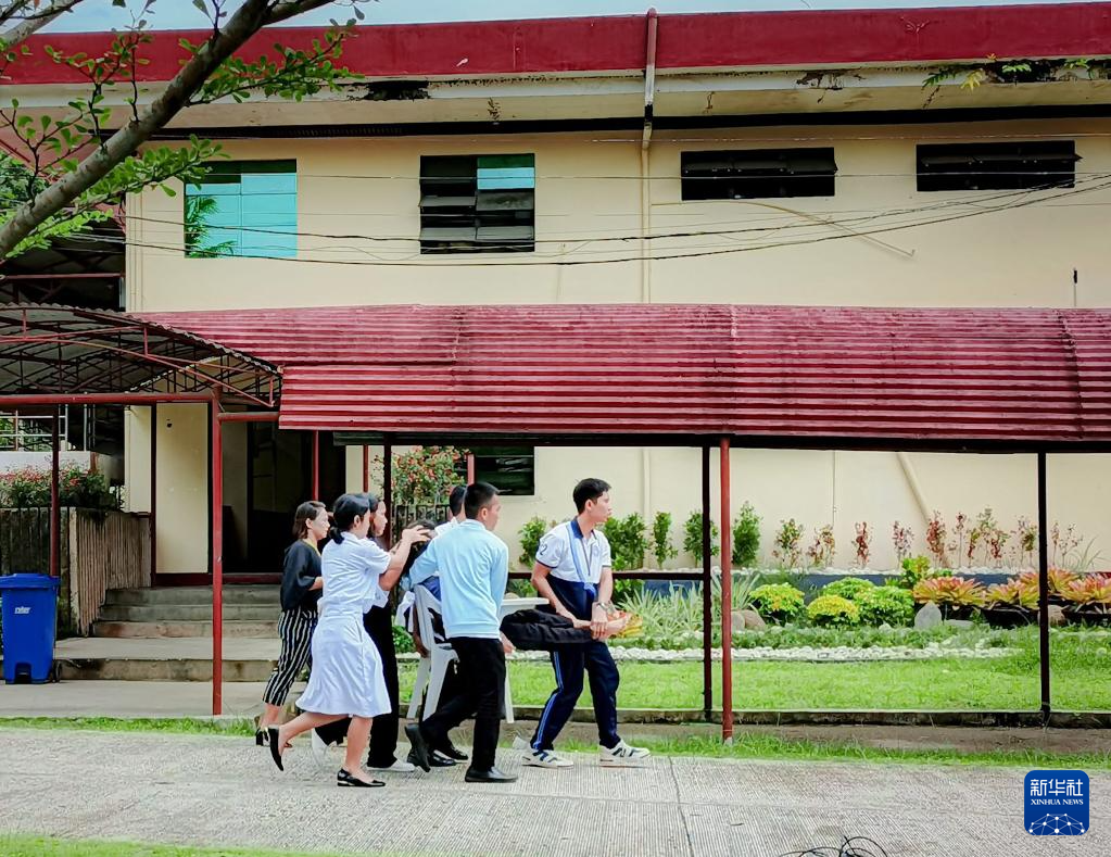 10月10日,在菲律宾南阿古桑省一所大学,学生们从建筑物中疏散至户外。