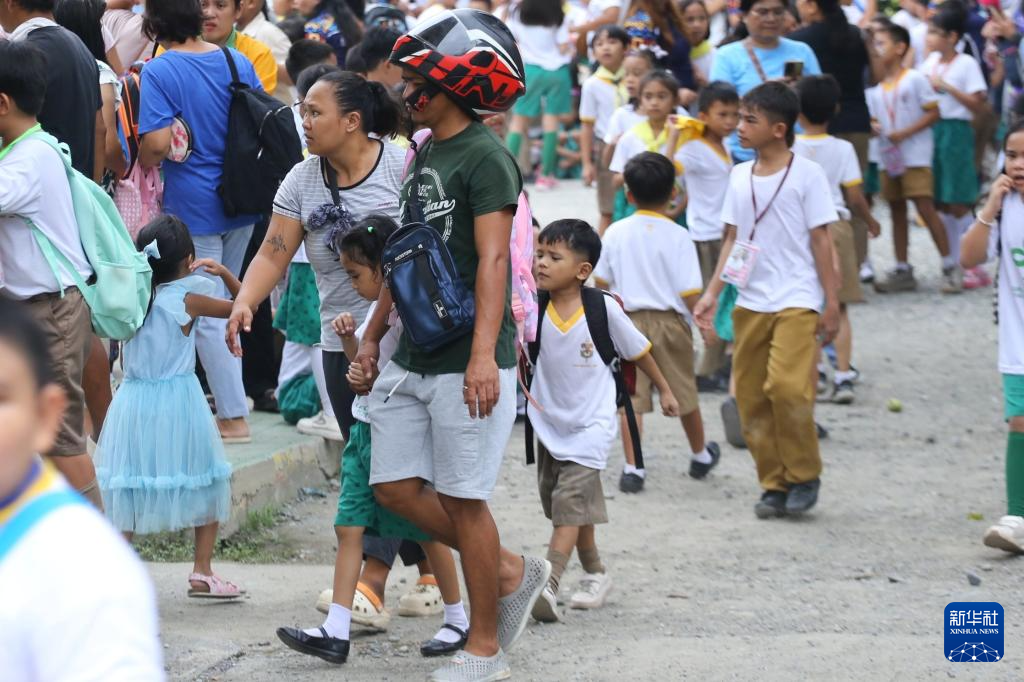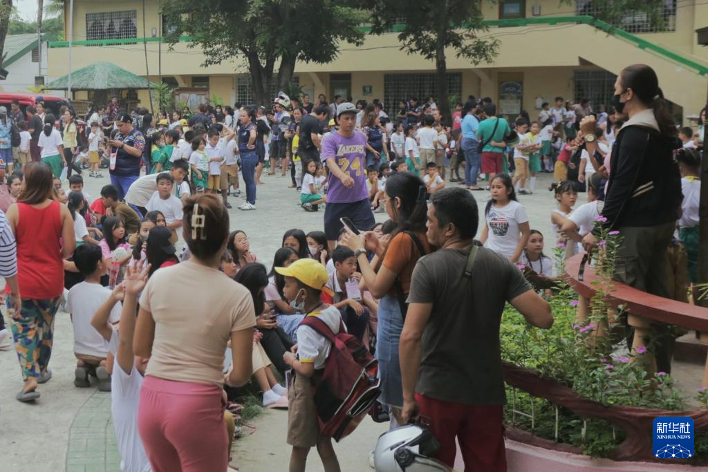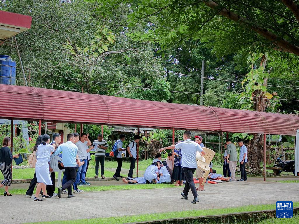 10月10日,在菲律宾南达沃省一所学校,人们从建筑物中疏散至户外。