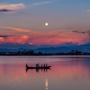 10月6日,人们乘船在云南大理洱源西湖赏月(无人机照片)。