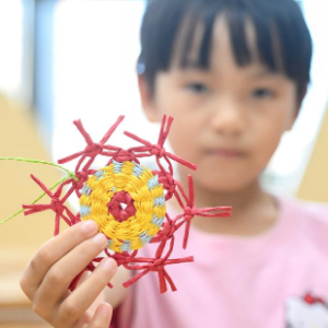 10月12日,在海南省文化馆,小朋友学习东山草编技艺。