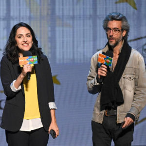 10月12日,在位于北京的中央歌剧院剧场,音乐戏剧《小王子》导演让·贝洛里尼(右)、总制作人安娜出席发布会。