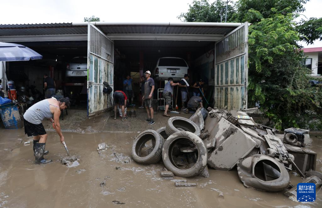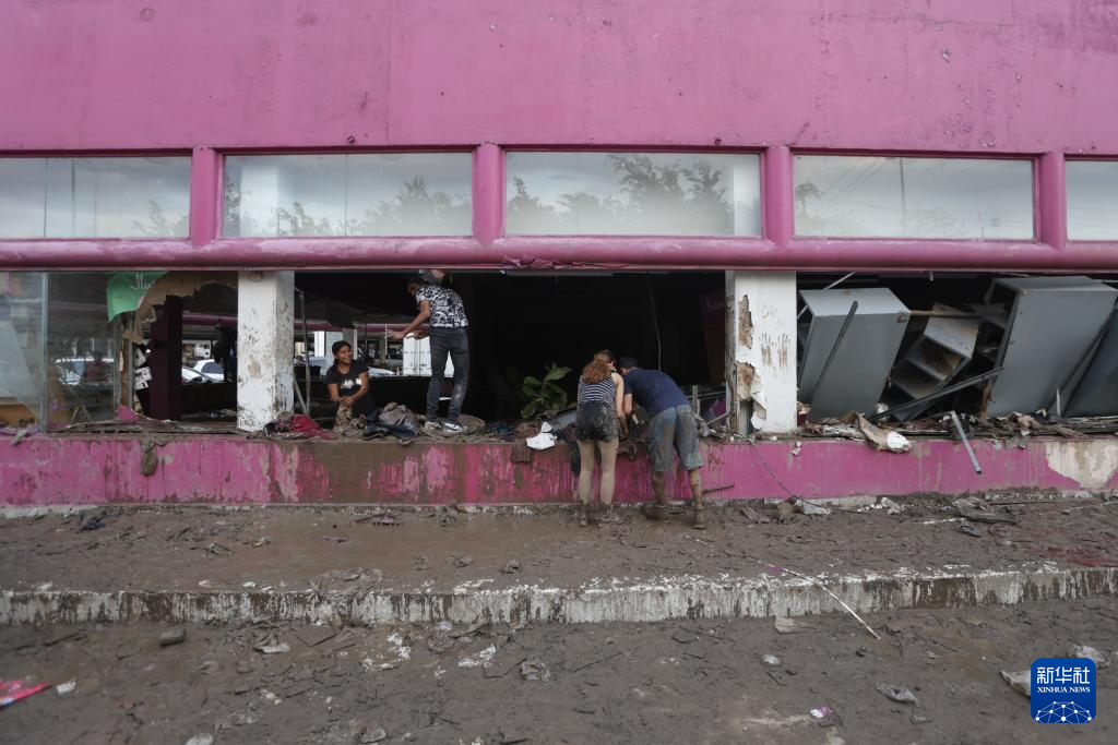 10月11日,在墨西哥韦拉克鲁斯州波萨里卡,人们清整因强降雨受损的建筑。