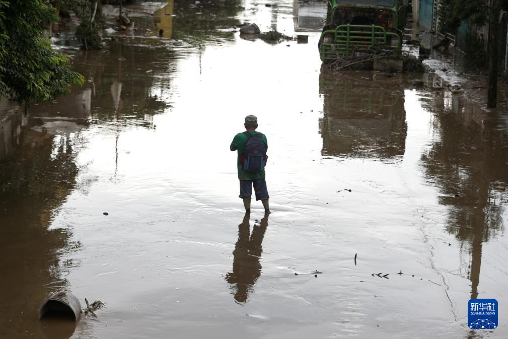 10月11日,在墨西哥韦拉克鲁斯州波萨里卡,一名男子站在满是泥水的街道上。