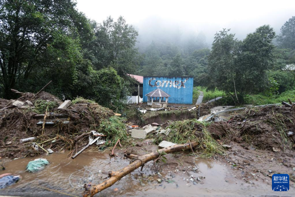 这是10月11日拍摄的墨西哥普埃布拉州瓦乌奇南戈市一条受降雨影响而部分封闭的道路。