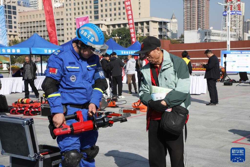 10月13日,在兰州市东方红广场,甘肃蓝天救援队队员为观众介绍救援装备。