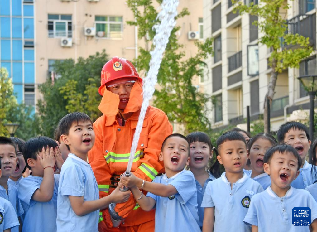 10月13日,浙江省台州市仙居县中心幼儿园微型消防站工作人员为仙居县中心幼儿园的孩子们演示消防水枪使用方法。