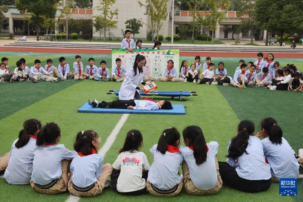 10月13日,在江苏省泰州市周山河小学,医护人员为学生讲解急救常识。