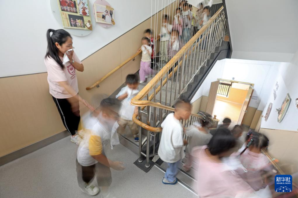 10月13日,江苏省常州市武进区刘海粟幼儿园小朋友在老师指导下进行火灾应急疏散演练。