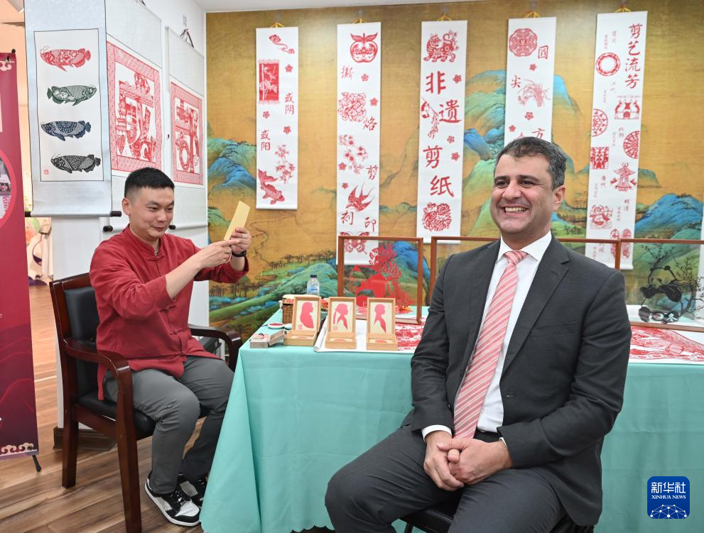 10月12日,在科威特哈瓦利省,一名男子在科威特中国文化中心体验中国剪纸肖像。