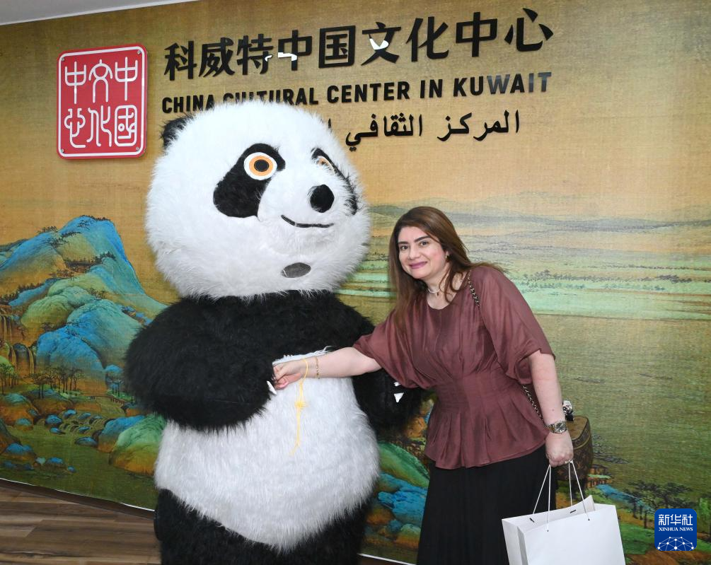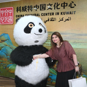 10月12日,在科威特哈瓦利省,一名女子在科威特中国文化中心与熊猫人偶互动合影。