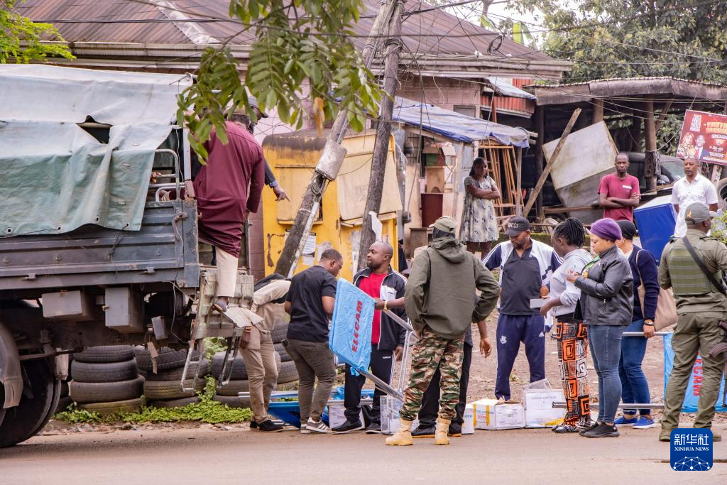 10月12日,在喀麦隆西南大区首府布埃亚,选举工作人员和安保人员在投票站开放前准备投票材料。