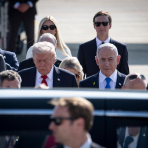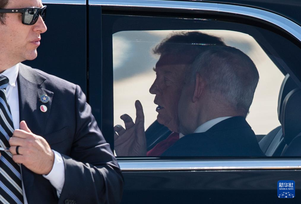 10月13日,在以色列本-古里安机场,以色列总理内塔尼亚胡(前)同到访的美国总统特朗普同乘一辆车。