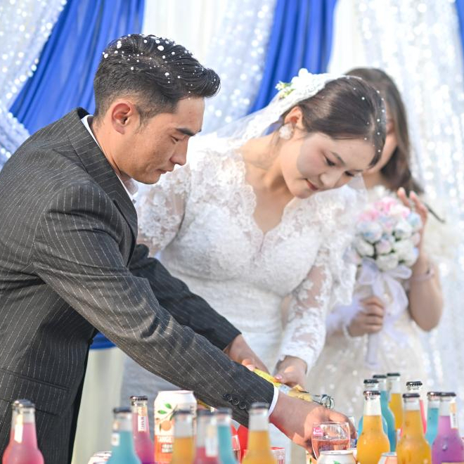 傍晚,在年轻亲友的簇拥下,这对新人在特克斯河边的太极岛森林公园举行户外婚礼仪式。孔吐斯换上白色婚纱,布开汗换上黑色西装。仪式上,孔吐斯和布开汗喝交杯酒、喷洒香槟、与亲朋好友共舞、互动游戏,热烈精彩的氛围吸引了不少游客围观。