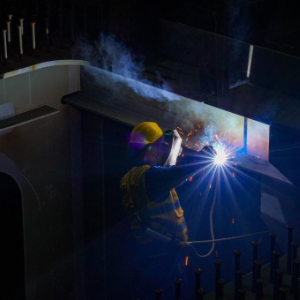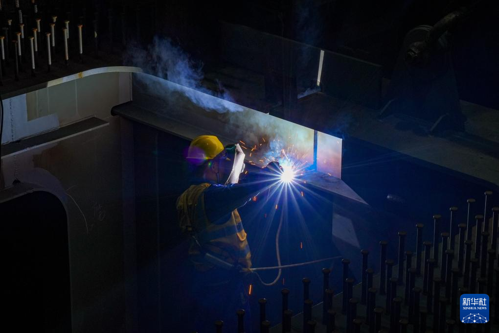 10月13日,中铁十七局工人在成达万高铁遂宁涪江特大桥施工现场焊接钢箱梁。