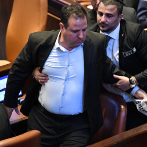 10月13日,美国总统特朗普在位于耶路撒冷的以色列议会发表演讲期间,一名议员举起“承认巴勒斯坦国”标语牌抗议后被带走。