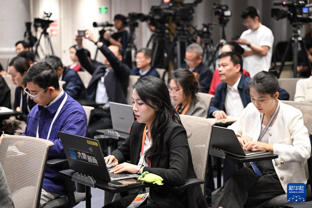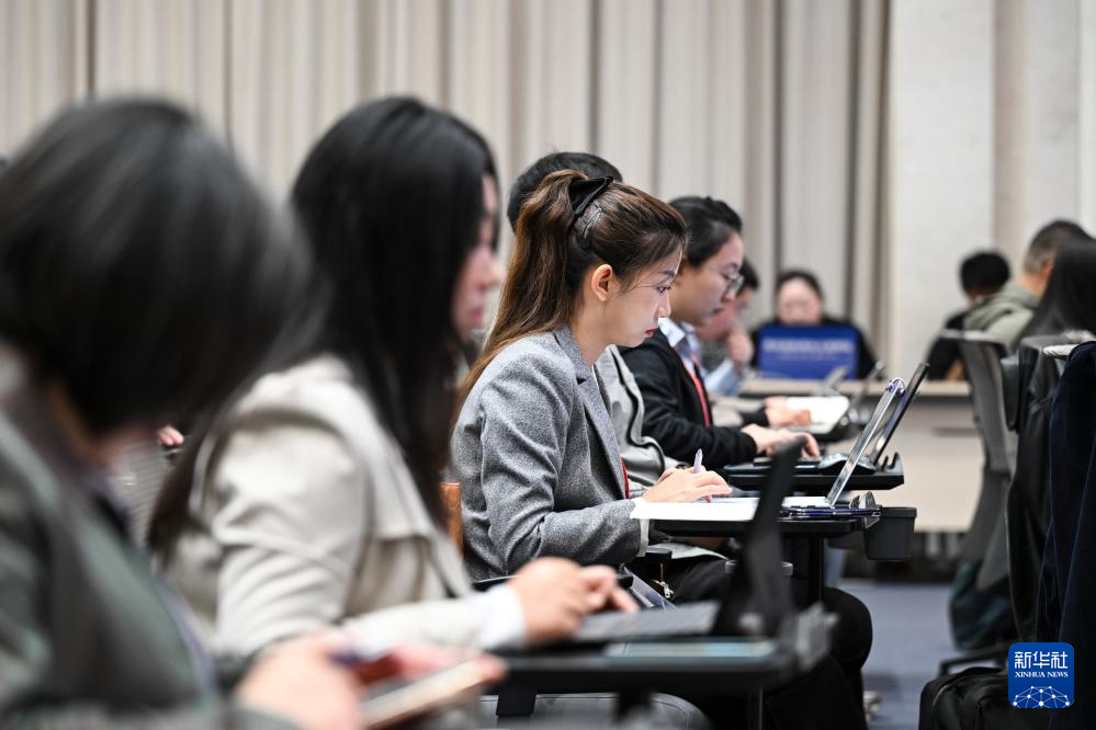 10月14日,国务院新闻办公室在北京举行“高质量完成‘十四五’规划”系列主题新闻发布会,国家发展改革委党组成员、国家粮食和物资储备局局长刘焕鑫,国家粮食和物资储备局副局长钱毅、副局长秦玉云介绍“十四五”时期粮食流通改革发展成效,并答记者问。这是记者在现场工作。