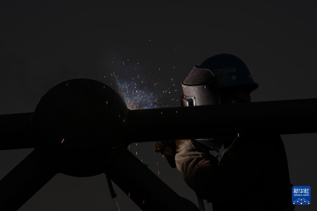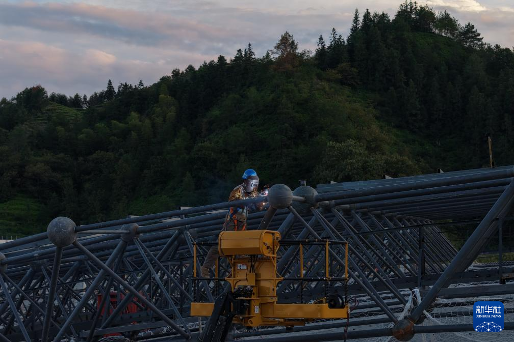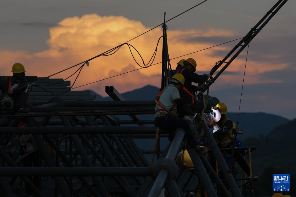10月14日,建设者在衢丽铁路东西岩站站房候车厅钢网架上进行焊接作业。
