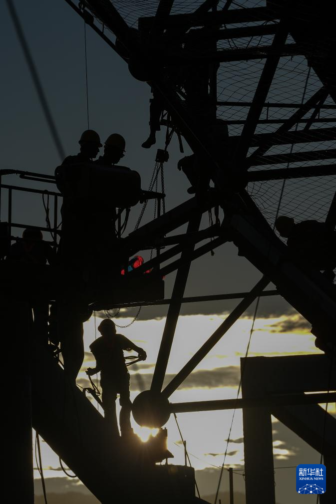 10月14日,建设者在衢丽铁路东西岩站站房候车厅钢网架上作业(无人机照片)。