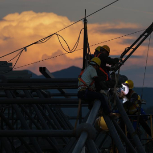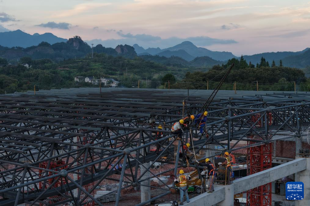 10月14日,建设者在衢丽铁路东西岩站站房候车厅钢网架上作业。