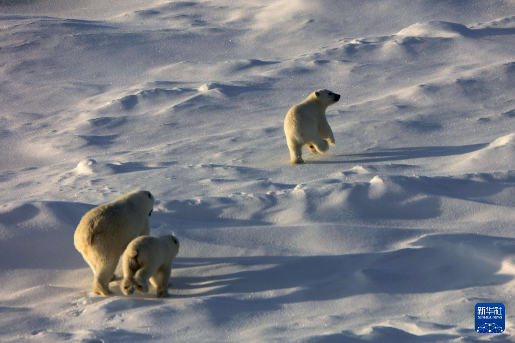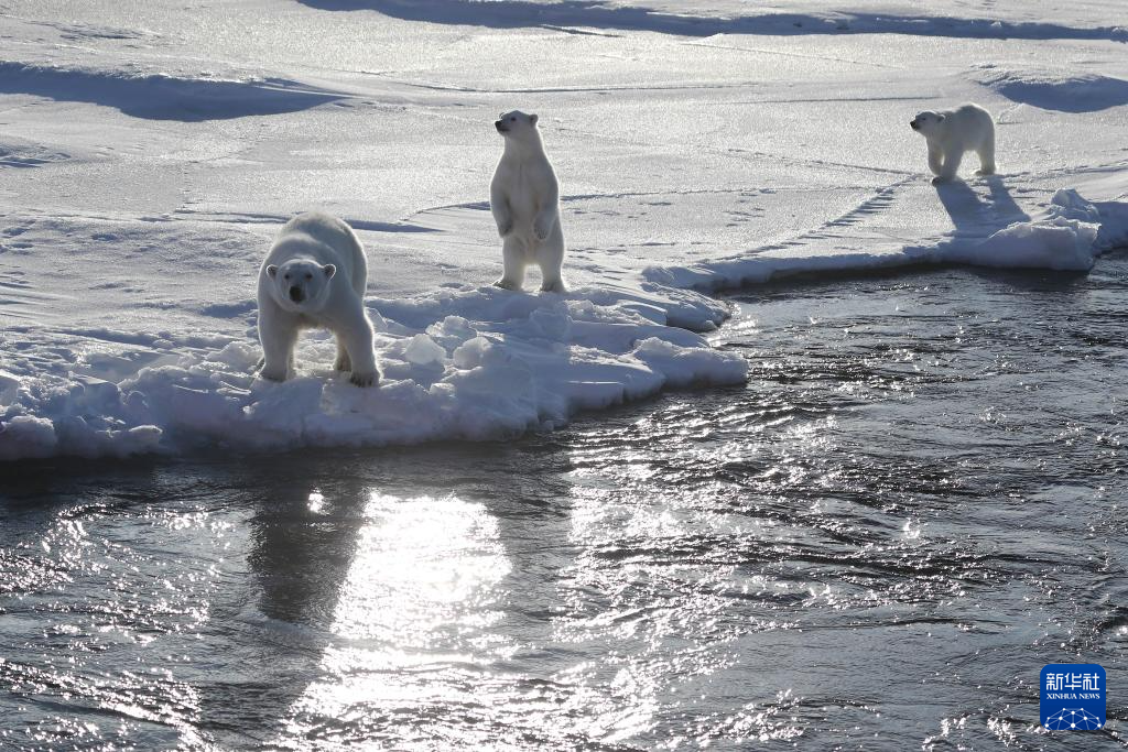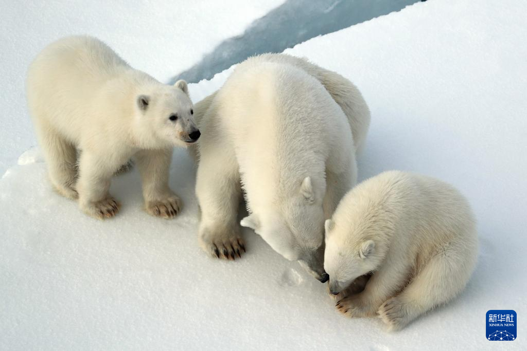 这是8月30日在北冰洋高纬度地区拍摄的北极熊妈妈和两只熊宝宝(无人机照片)。