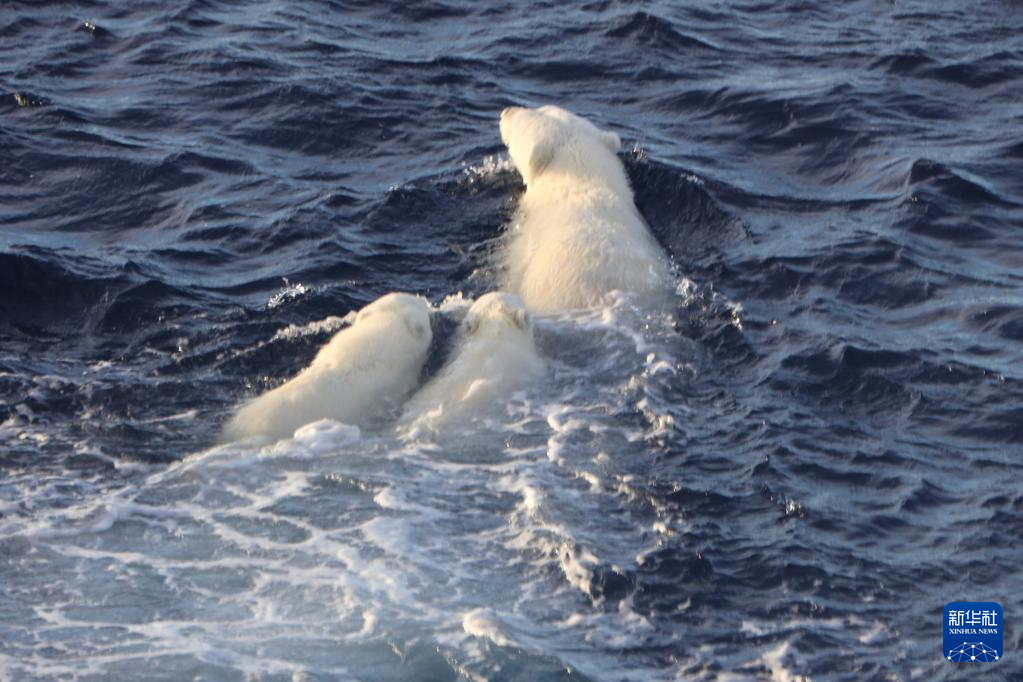 这是8月31日在北冰洋高纬度地区拍摄的在游泳的北极熊妈妈和两只熊宝宝。
