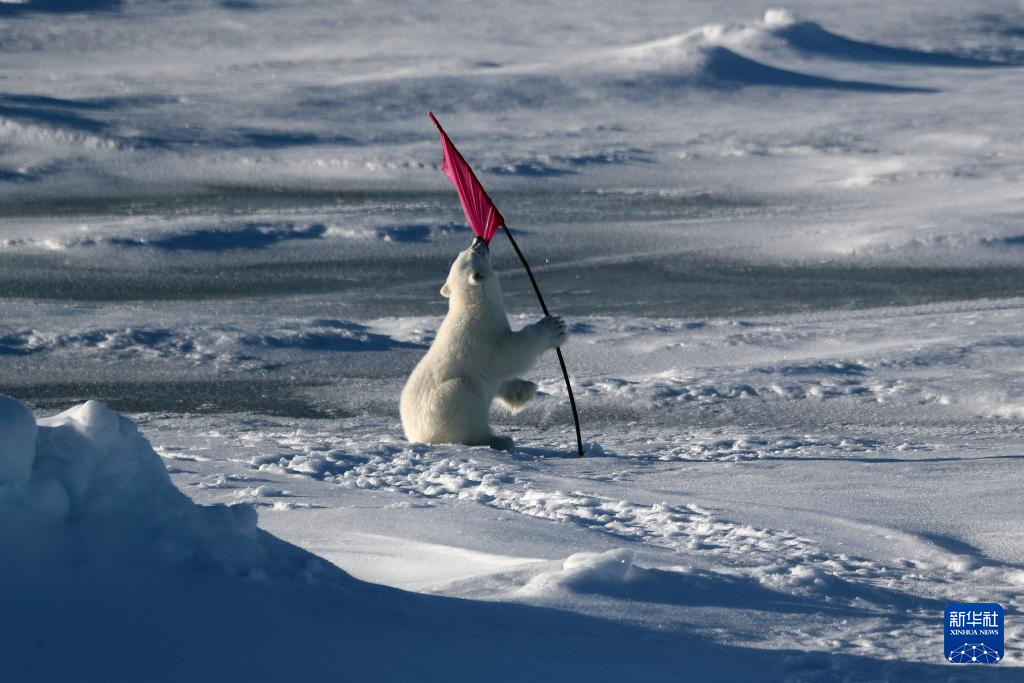 8月31日,一只北极熊宝宝在玩耍考察队作业时插的小旗。