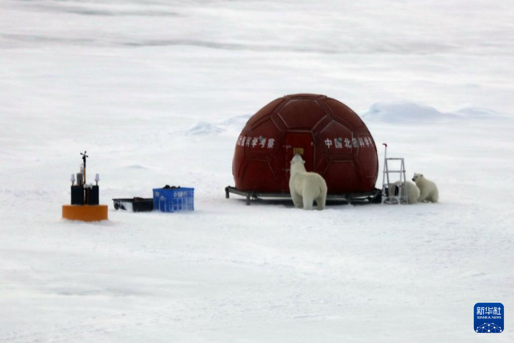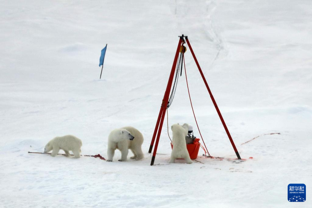 8月30日,北极熊妈妈和两只熊宝宝在考察队尚未完成布放的冰基浮标处活动。