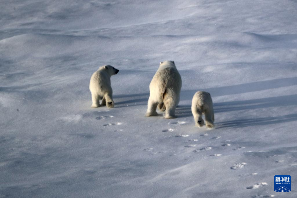 8月31日,北极熊妈妈和两只熊宝宝离开考察队冰上作业区。