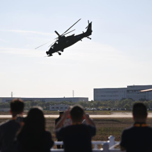 10月14日在天津直博会直升机馆内拍摄的直升机模型。