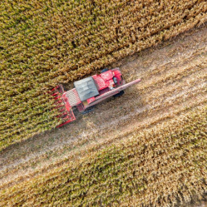 10月15日,在内蒙古巴彦淖尔市乌拉特前旗,农民驾驶农机收割玉米(无人机照片)。