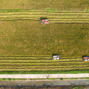10月15日,在南县南洲镇育才村,农机手将收获的水稻装入运粮车(无人机照片)。