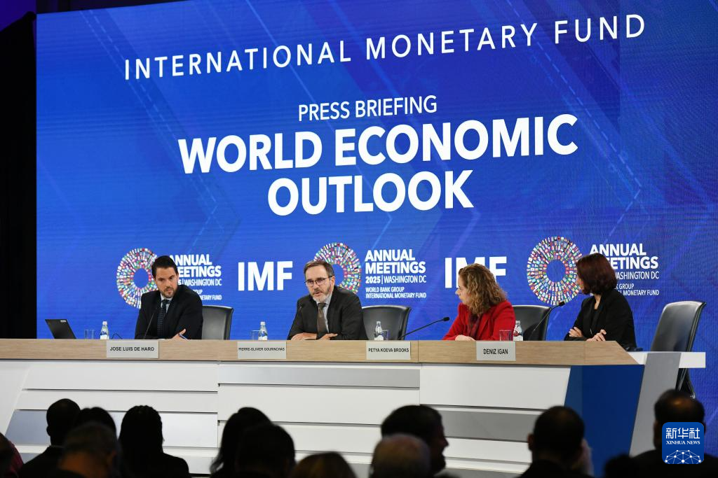 10月14日,在美国华盛顿,国际货币基金组织首席经济学家皮埃尔-奥利维耶·古兰沙(左二)在《世界经济展望报告》新闻发布会上讲话。