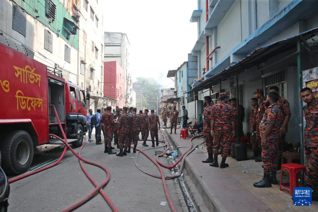 10月15日,在孟加拉国首都达卡,消防人员在制衣厂和化学品仓库火灾现场附近工作。