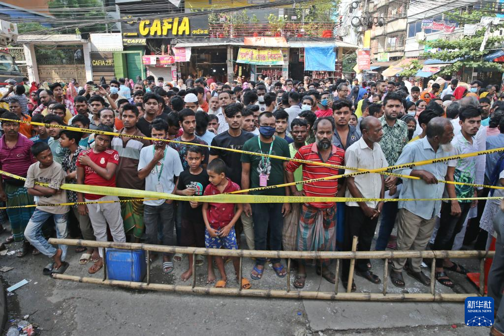 10月15日,在孟加拉国首都达卡,人们在制衣厂和化学品仓库火灾现场附近围观。