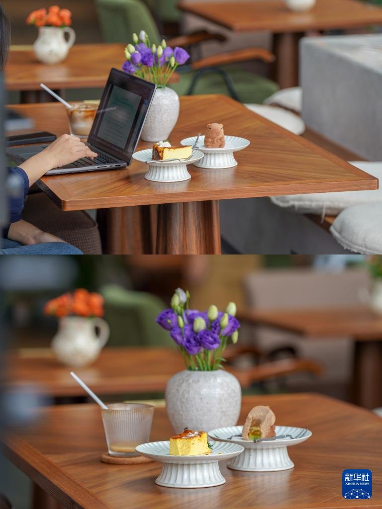 拼版照片:上图为10月11日,一名顾客在云南昆明某甜品店吃甜品;下图为仅吃了几口就被遗弃的蛋糕。